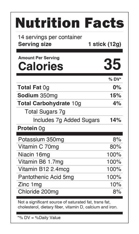 Pure Cane Sugar, Dextrose, Natural Flavor, Tripotassium Citrate, Sodium Citrate, Citric Acid, Sodium Chloride, Caffeine, Ascorbic Acid (Vitamin C), Sucralose, L-Theanine, Silicon Dioxide, Niacinamide (Vitamin B3), Zinc Gluconate, D-Calcium Pantothenate (Vitamin B5), Pyridoxine Hydrochloride (Vitamin B6), Cyanocobalamin (Vitamin B12)