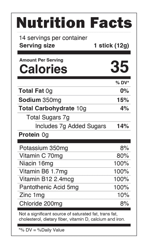 Pure Cane Sugar, Dextrose, Natural Flavor, Citric Acid, Tripotassium Citrate, Sodium Citrate, Sodium Chloride, Alpha-GPC, L-Theanine, Caffeine, Ascorbic Acid (Vitamin C), Sucralose, Silicon Dioxide, Niacinamide (Vitamin B3), Zinc Gluconate, D-Calcium Pantothenate (Vitamin B5), Pyridoxine Hydrochloride (Vitamin B6), Cyanocobalamin (Vitamin B12)
